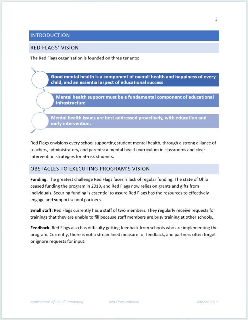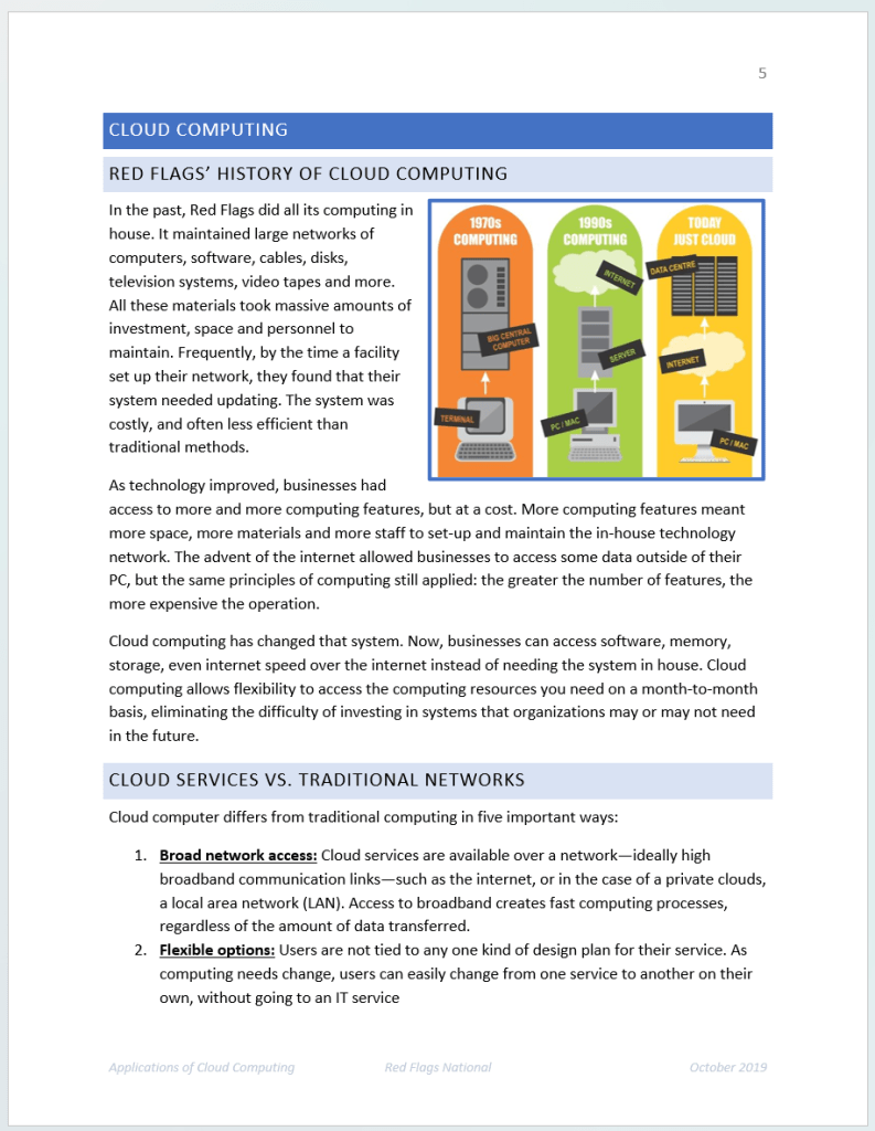 For this project I created a white paper on cloud computing for Red Flags National, a non-profit organization that works in school to educate staff teachers and students on effective mental health treatment. Selected from a larger document, the pages below highlight my skills in creating a readable, and well-researched documentation with skillful use of graphic elements to emphasize and illustrate complex ideas. The pages are not continuous and do not present cohesive text from image to image.